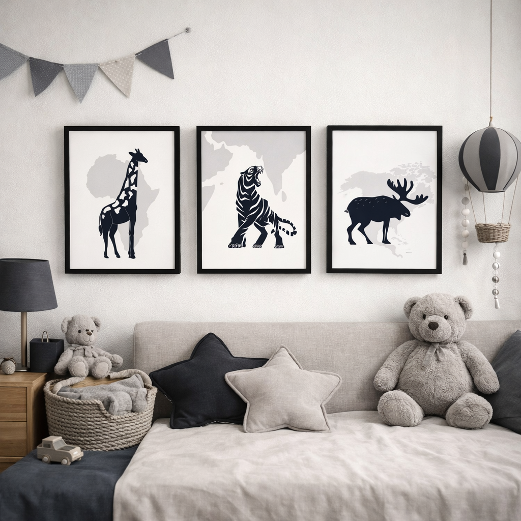 Ez a háromrészes képsorozat különleges állatokat ábrázol – tigrissel, zsiráffal és rénszarvassal –, mindegyikük a saját élőhelyük hátterében. Ez a sorozat tökéletes választás a természet és a különleges állatok kedvelőinek! Részei: 3 db kép (keret opcionális). Fedezd fel további inspiráló képeinket: Design képek