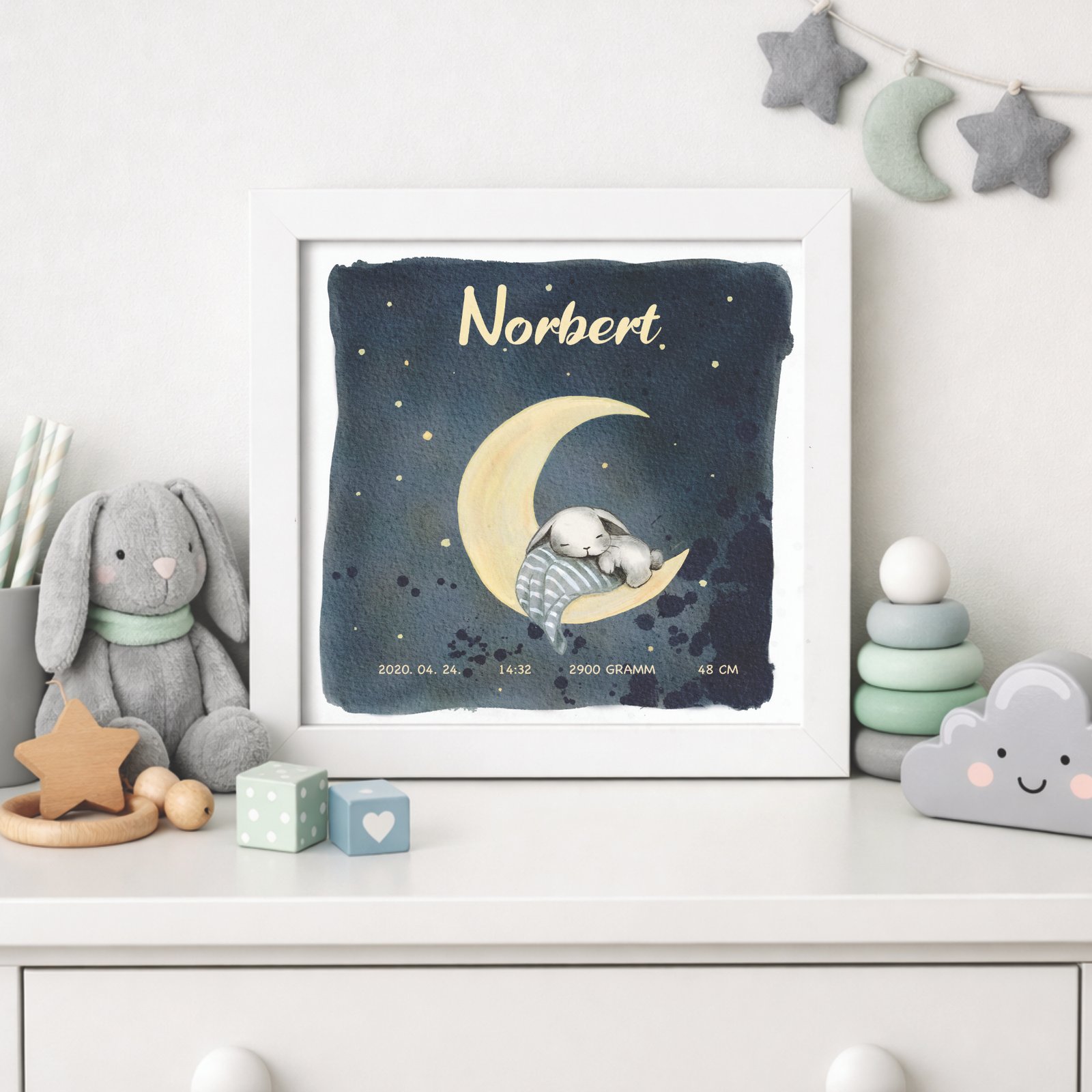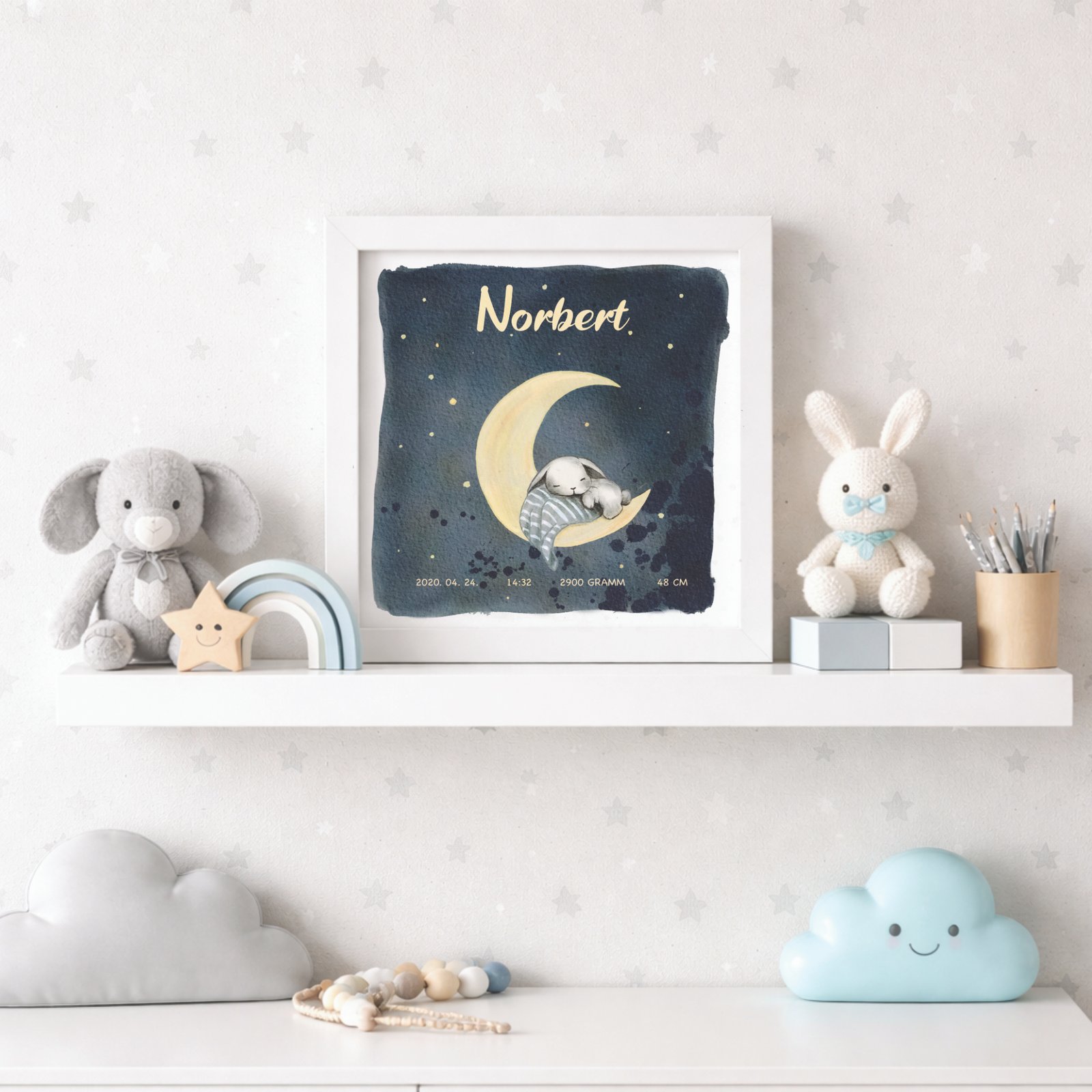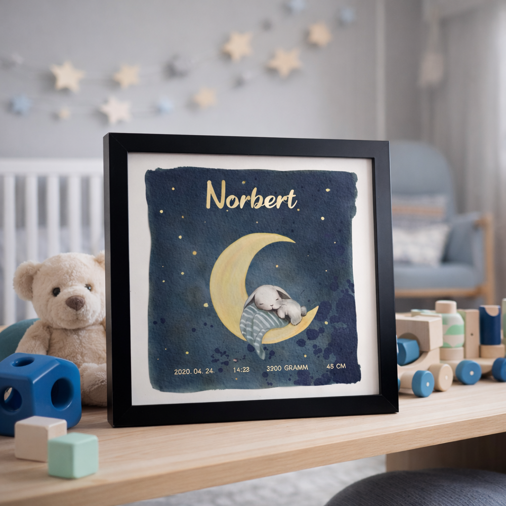 Ez az egyedi, alvó nyuszit ábrázoló kép tökéletes ajándék friss szülők számára. A vásárló személyre szabhatja a műalkotást és hozzáadhatja a gyermek nevét, születési hosszát, idejét és súlyát. A kép különleges és egyedülálló módon örökíti meg a kis jövevény első fontos pillanatait. További képekért kattints ide: Személyre szabható babás képek
