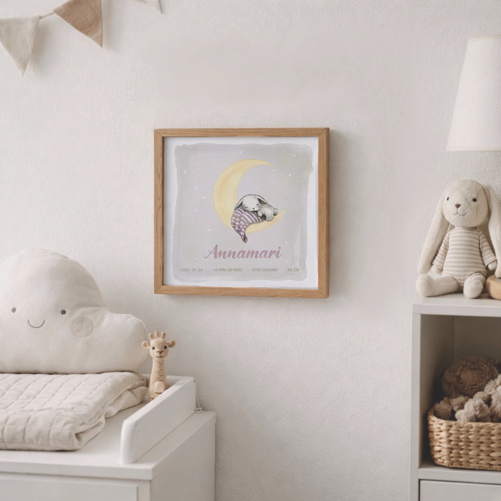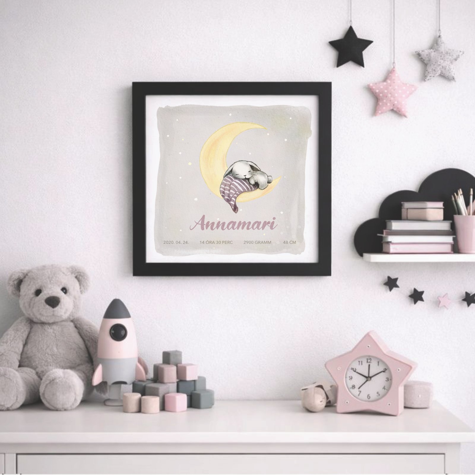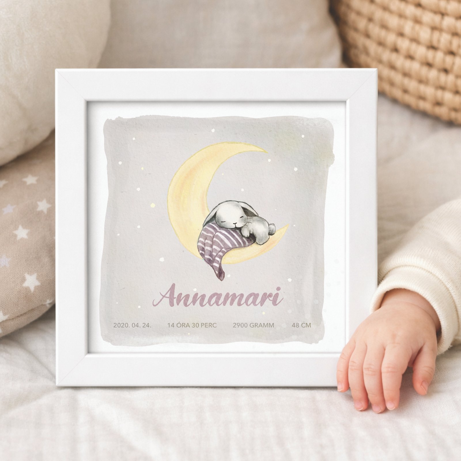 Ez a holdon alvó nyuszit ábrázoló kép tökéletes ajándék minden kisgyermek számára. A vásárló személyre szabhatja a műalkotást és hozzáadhatja a gyermek nevét, születési hosszát, idejét és súlyát. A kép különleges és egyedülálló módon örökíti meg a kis jövevény első fontos pillanatait. Fedezd fel a többi aranyos mintát itt: Személyre szabható babás képek
