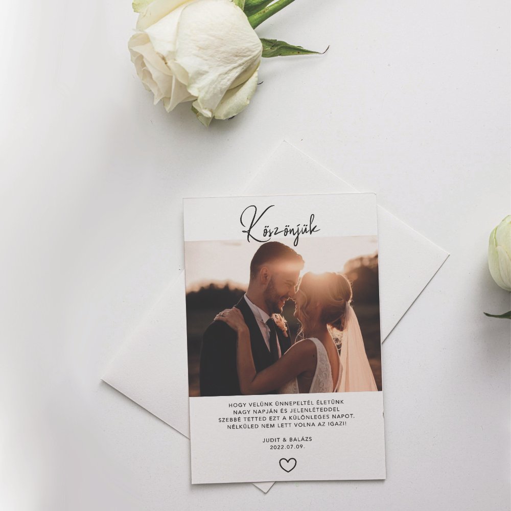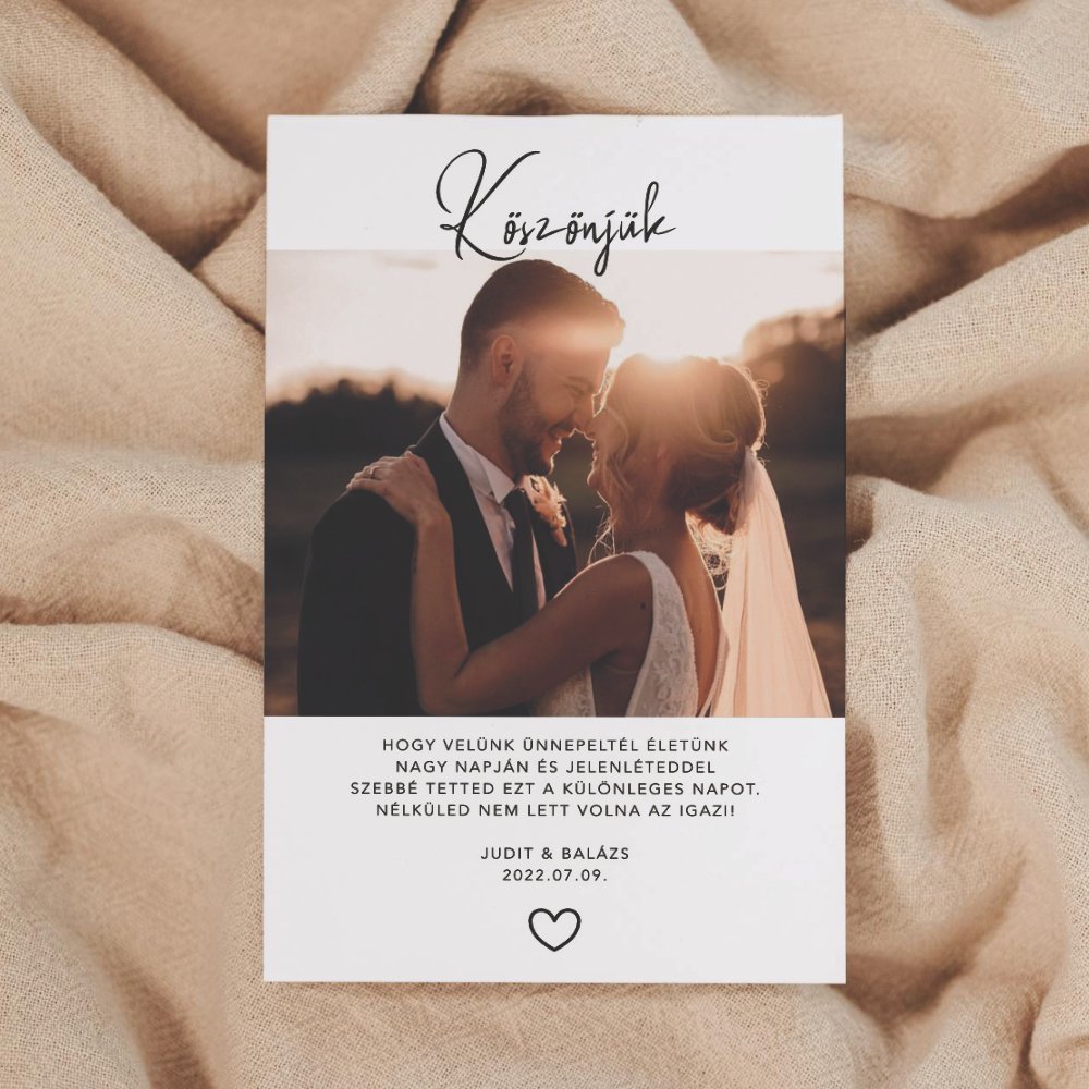 Ez az egyedi esküvői köszönőajándék különleges emléket ad vendégeidnek a nagy napról. A köszönőajándékon megadható a pár fotója, neve és az esküvő dátuma, így igazán személyes és megható gesztus minden meghívott számára. A minőségi nyomtatás és a gondosan megválasztott design elegáns megjelenést biztosít, amely tökéletesen illik bármilyen esküvői stílushoz. Kiváló választás, ha szeretnéd, hogy a vendégek egy maradandó, szívhez szóló emléket vigyenek haza az eseményről.