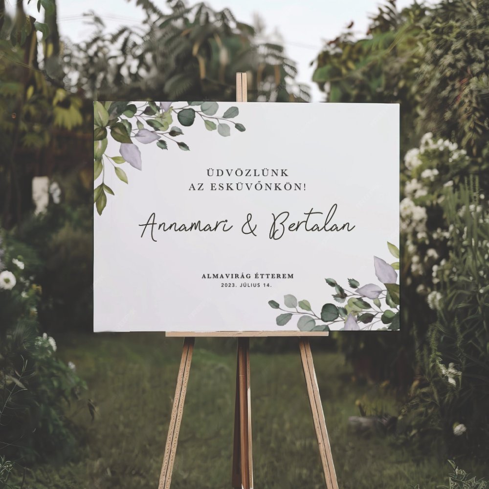 Ez az elegáns, zöld leveles mintájú esküvői üdvözlőtábla tökéletes kiegészítője a nagy napnak. A tábla személyre szabható a pár nevével, az esküvő helyszínével és dátumával, így egyedi és harmonikus hangulatot teremt a bejáratnál vagy a ceremónia helyszínén. Természetes, modern stílusa bármilyen esküvői dekorációhoz illik — legyen az rusztikus, boho vagy klasszikus. Minőségi nyomtatásának köszönhetően tartós emlékként is megőrizhető az esküvő után. Kiváló választás, ha szeretnéd, hogy a vendégek már érkezéskor különleges hangulatba kerüljenek.