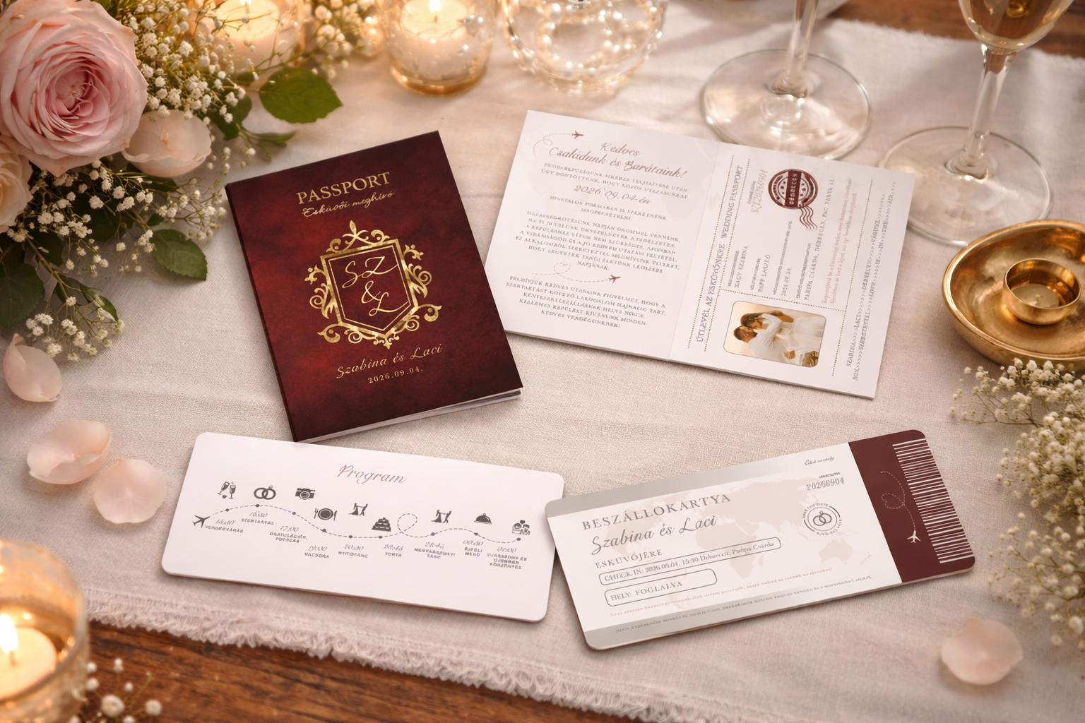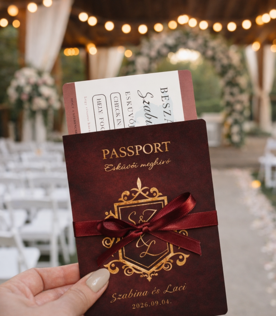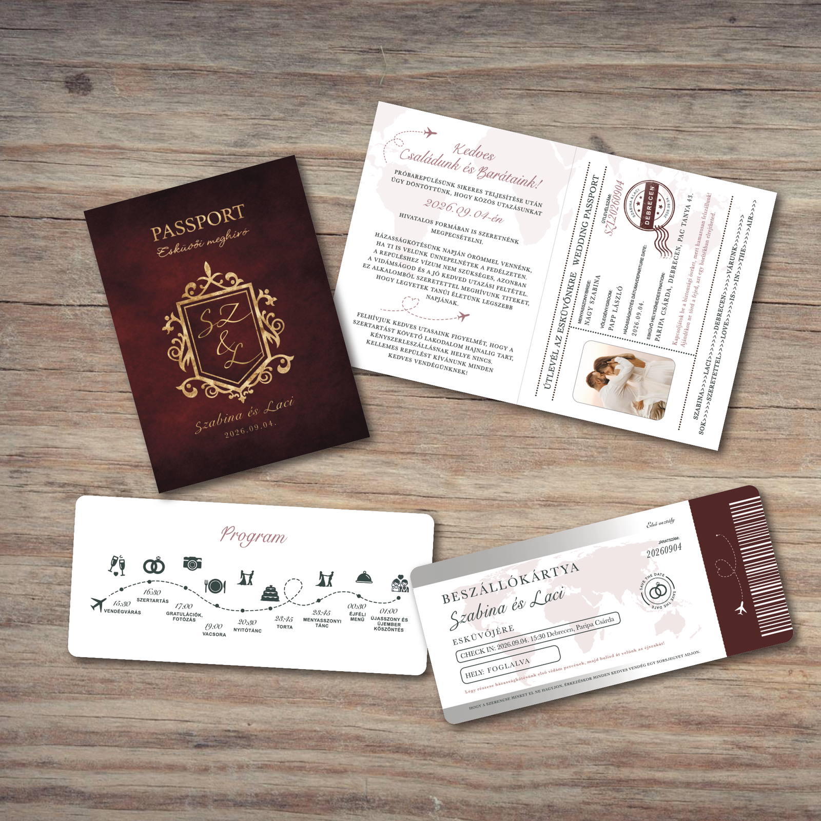 Esküvői útlevél, repülőjegy – útlevél formájú esküvői meghívó (bordó)