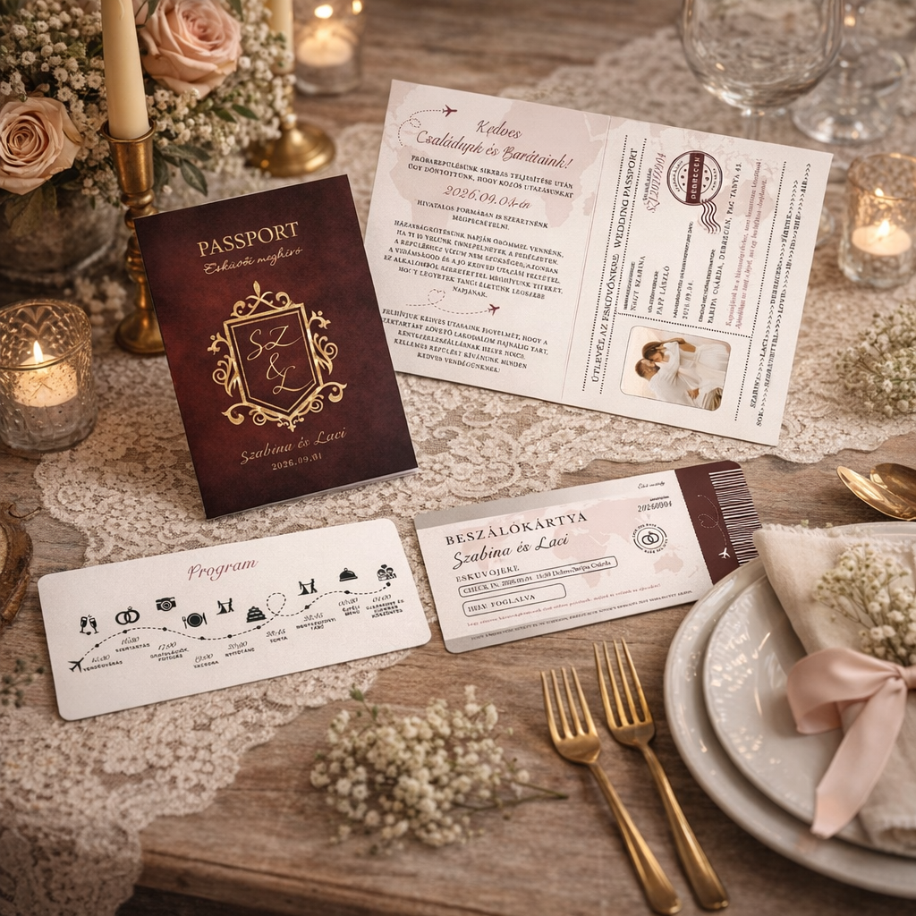 Ez az egyedülálló esküvői meghívó az útlevelek hatását kelti. A vásárlók megadhatják esküvőjük részleteit, például a dátumot, helyszínt és a pár nevét. Ez az útlevél stílusú meghívó nemcsak a vendégeket, hanem a pár számára is szimbolizálja az új, közös életük kezdetét, egy új út elindulását. A kreatív dizájn és a figyelmes részletek garantálják, hogy a meghívó már önállóan is emlékezetes legyen. Két részből áll: kinyitható útlevél és repülőjegy (a képen mindkét oldaluk látható). Fedezd fel további képeinket: Design képek