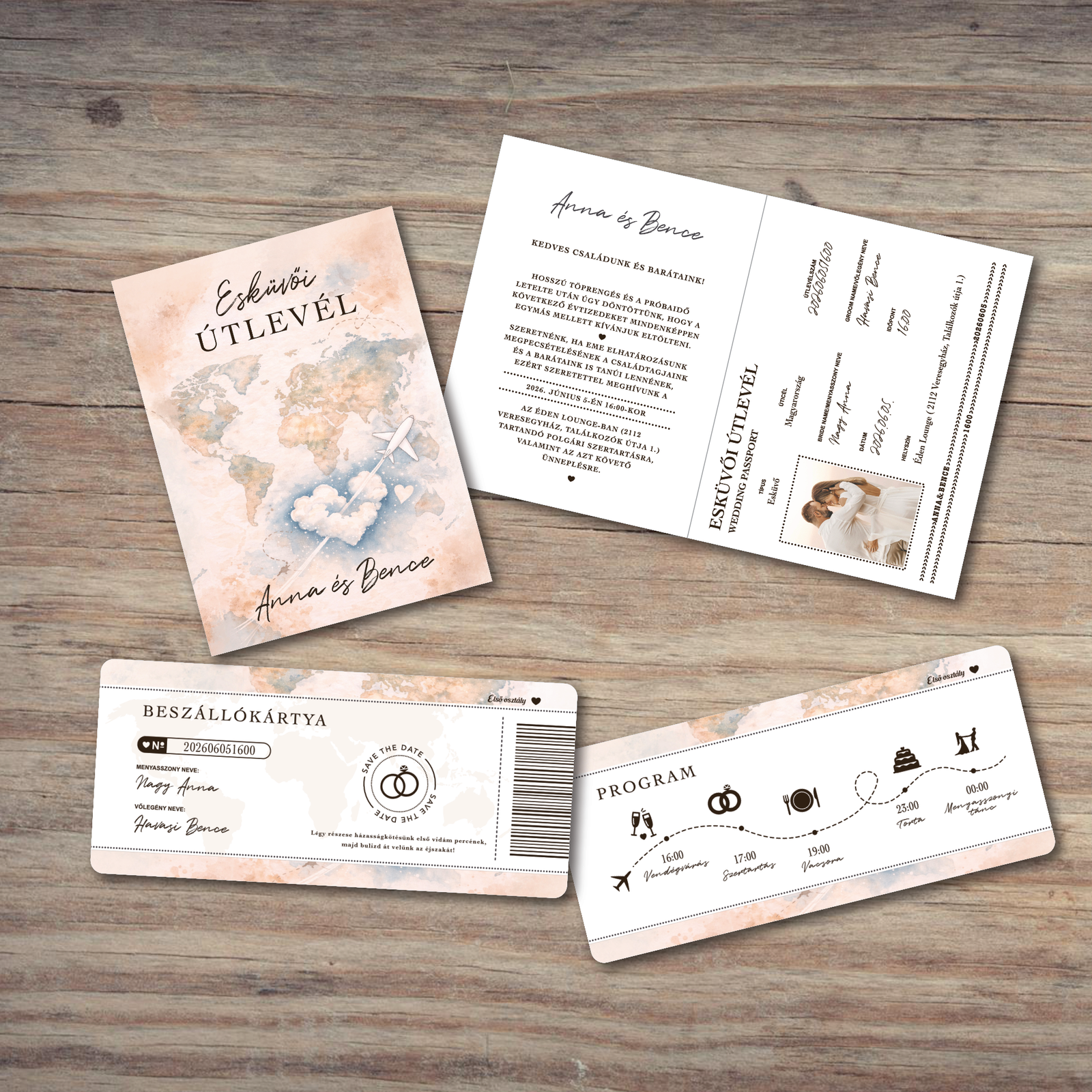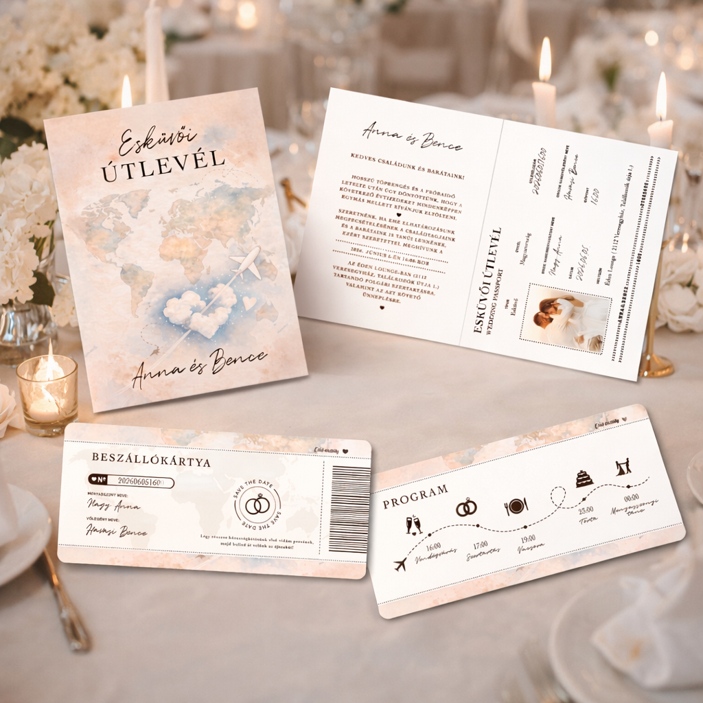 Ez az egyedülálló esküvői meghívó az útlevelek hatását kelti. A vásárlók megadhatják esküvőjük részleteit, például a dátumot, helyszínt és a pár nevét. Ez az útlevél stílusú meghívó nemcsak a vendégeket, hanem a pár számára is szimbolizálja az új, közös életük kezdetét, egy új út elindulását. A kreatív dizájn és a figyelmes részletek garantálják, hogy a meghívó már önállóan is emlékezetes legyen. Két részből áll: kinyitható útlevél és repülőjegy (a képen mindkét oldaluk látható). Fedezd fel további képeinket: Design képek