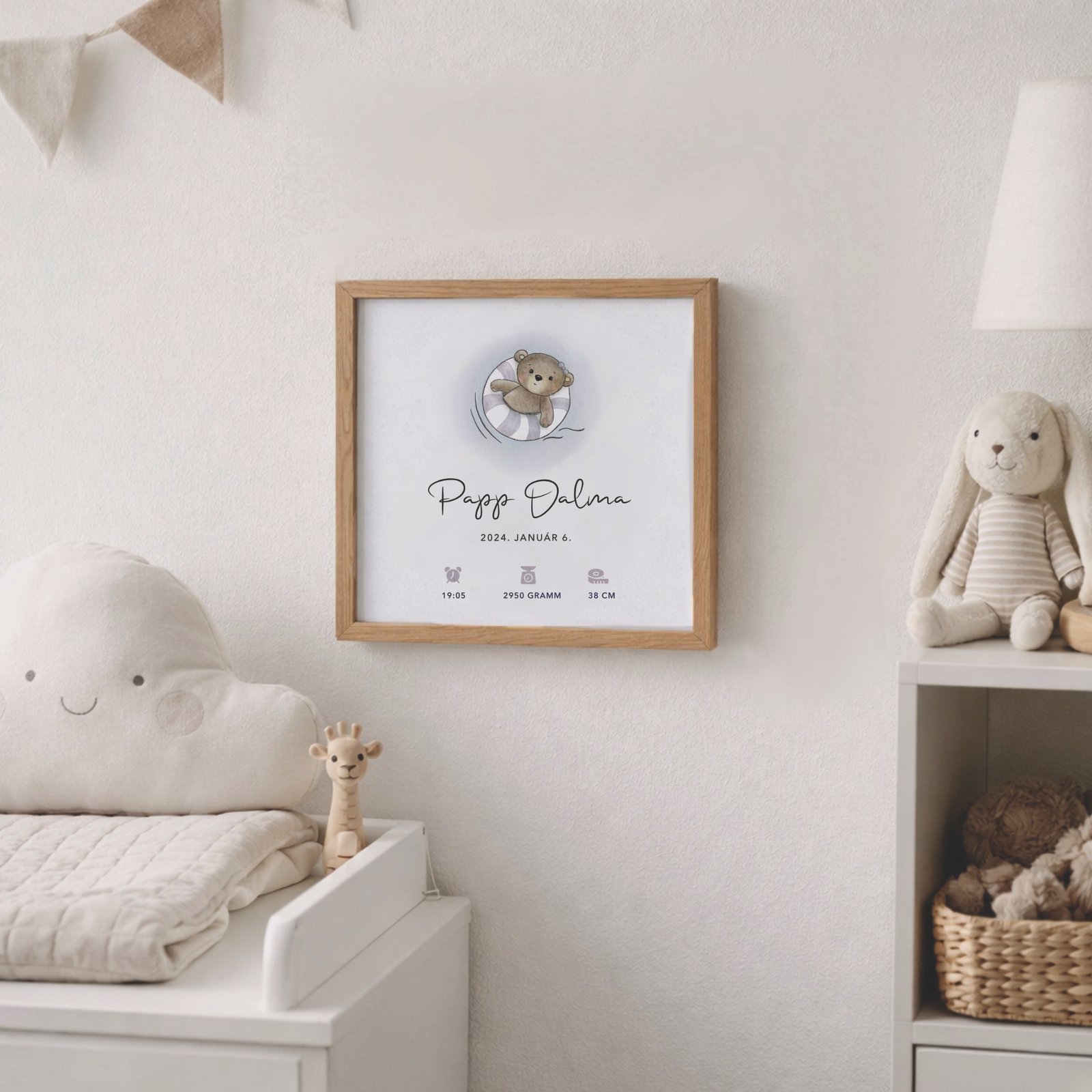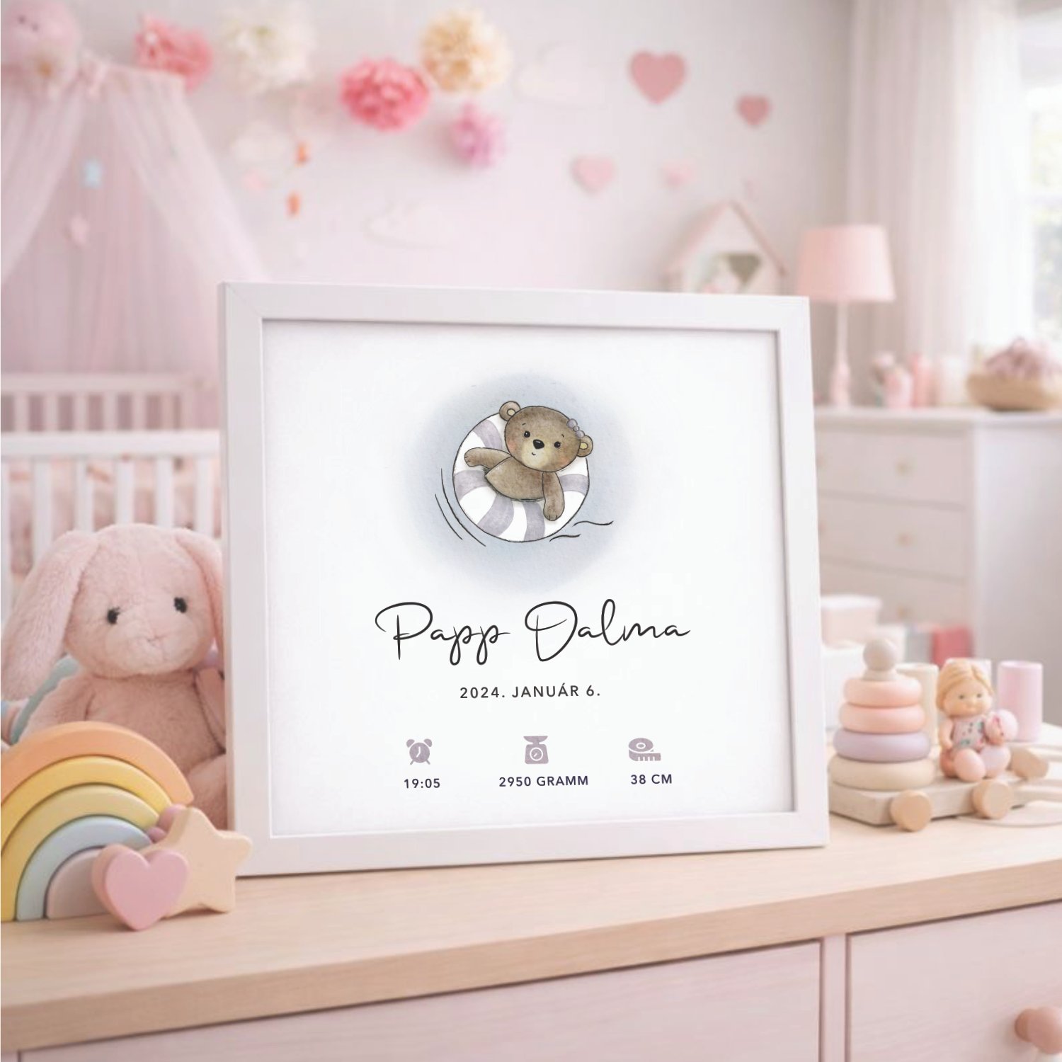 Ez az egyedi, macit ábrázoló kép tökéletes ajándék minden kisgyermek számára. A vásárló személyre szabhatja a műalkotást és hozzáadhatja a gyermek nevét, születési hosszát, idejét és súlyát. A kép különleges és egyedülálló módon örökíti meg a kis jövevény első fontos pillanatait. Böngéssz a többi egyedi poszter között is: Babás képek
