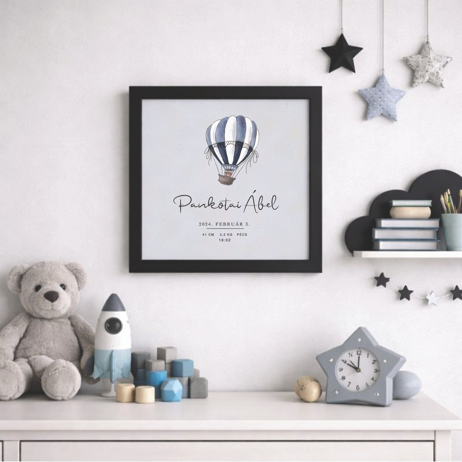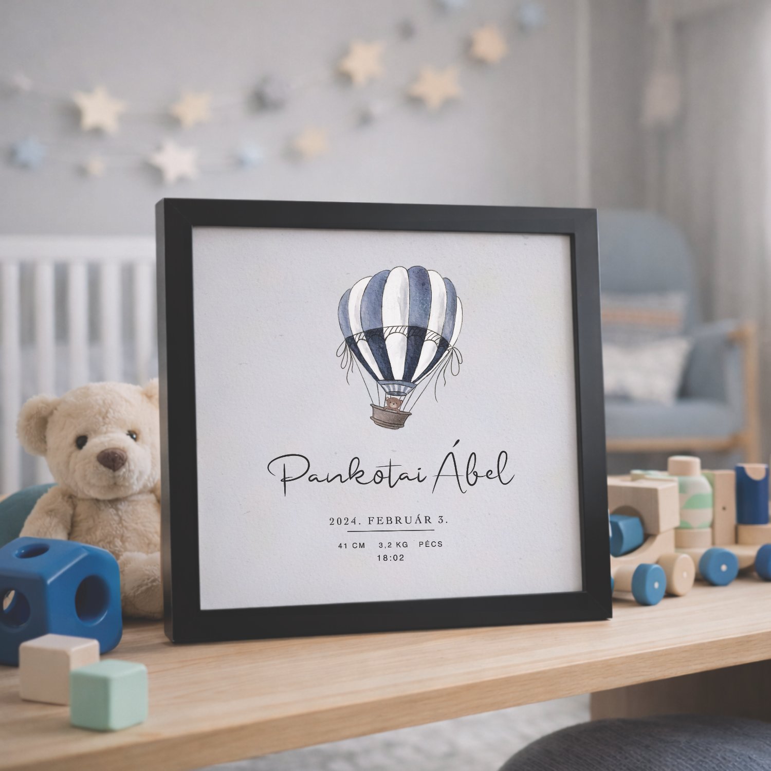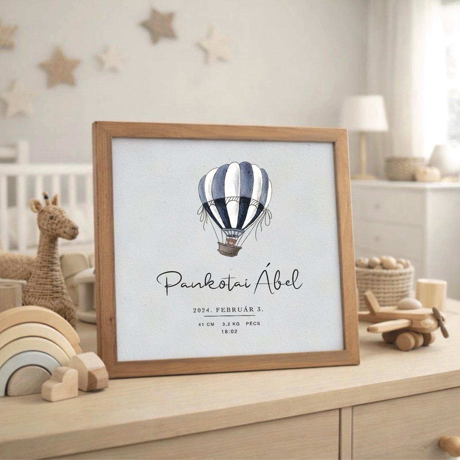 A hőlégballonos babaposzter egy varázslatos dekoráció, amelyben a baba születési adatai gyönyörű formában öröklődnek meg. A minőségi nyomat stílust és melegséget ad a gyerekszobának. Kiváló ajándék születésnapra, keresztelőre vagy babalátogatóra. További mintákért kattints ide: Személyre szabható babás képek