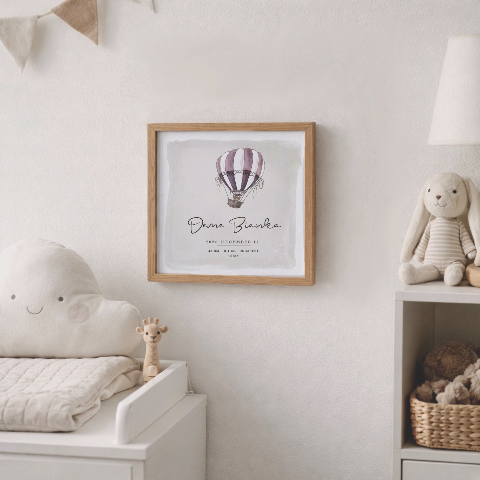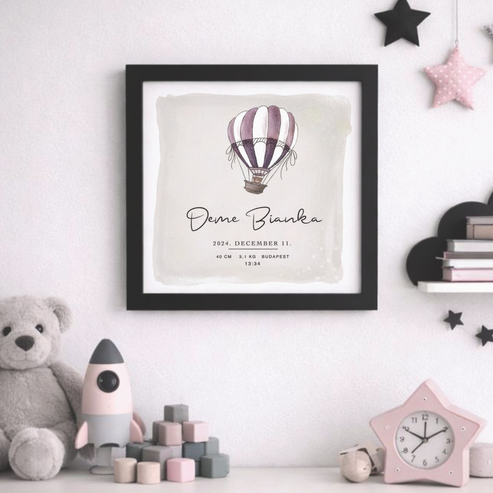 Ez az egyedi hőlégballonos kép tökéletes módja annak, hogy megőrizd gyermeked első pillanatait. A vásárló személyre szabhatja a képet a gyermek nevének, születési idejének, hosszúságának és súlyának a megadásával. Egy különleges és személyes ajándék, mely örökre megőrzi a kis jövevény születésének emlékét. Fedezd fel további képeinket: Design képek