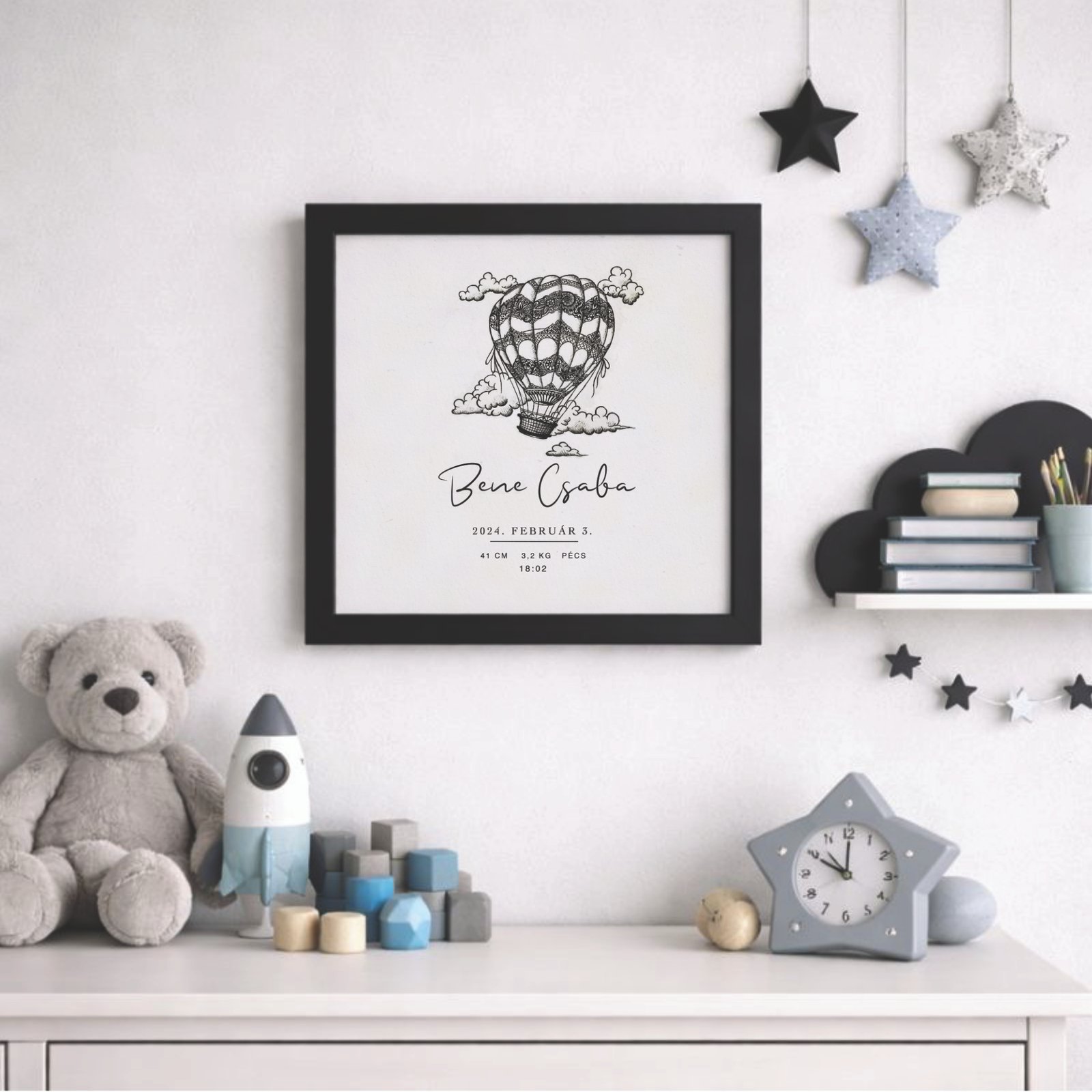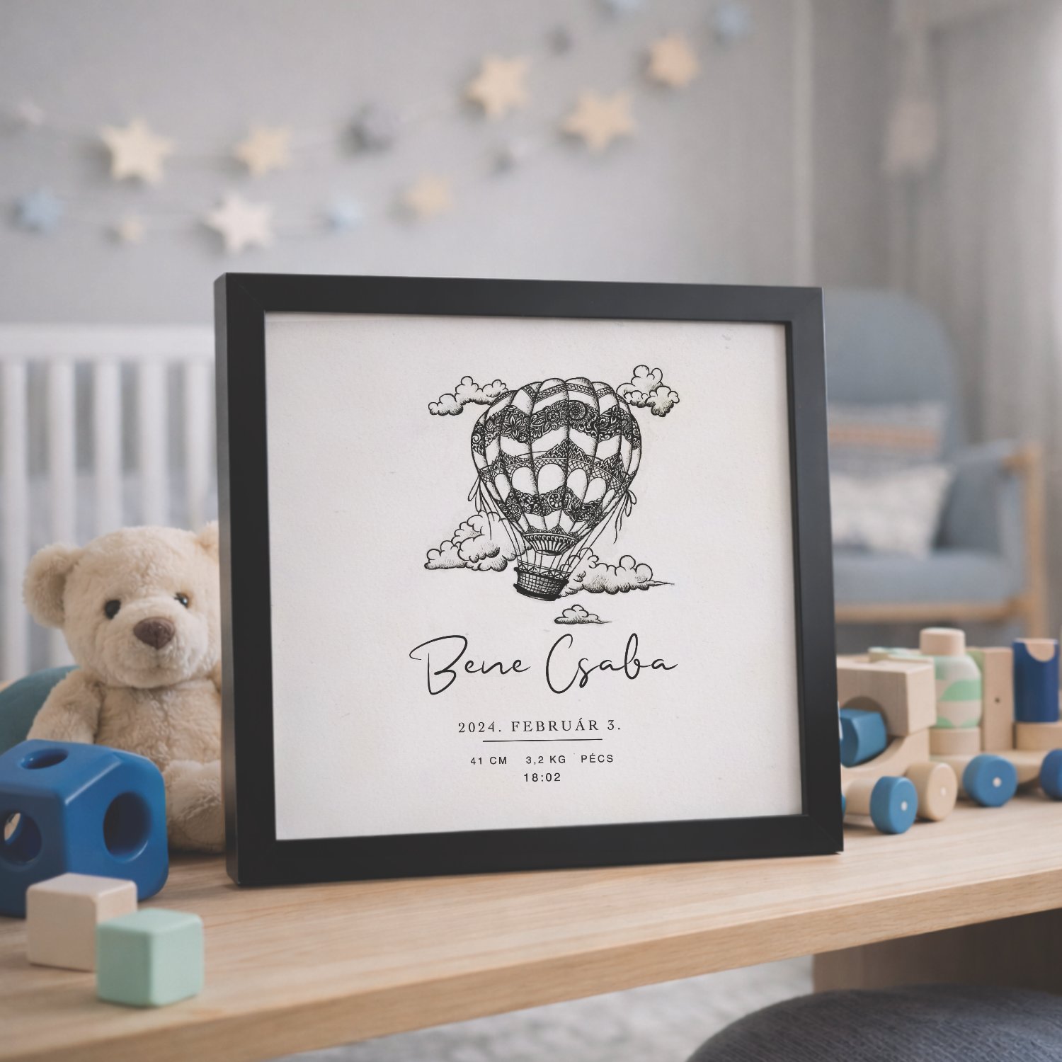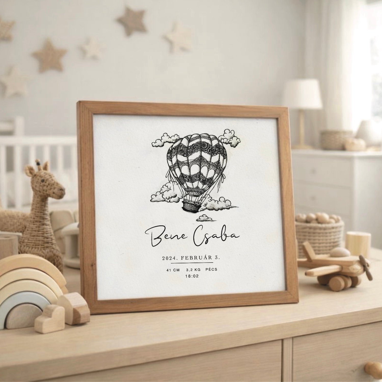 Ez az egyedi hőlégballonos kép tökéletes módja annak, hogy megörökítsd gyermeked első pillanatait. A vásárló személyre szabhatja a műalkotást a gyermek nevének, születési idejének, hosszúságának és súlyának megadásával. Egy különleges, személyre szabott ajándék, amely örök emlékként marad meg a család számára. További képekért kattints ide: Személyre szabható babás képek