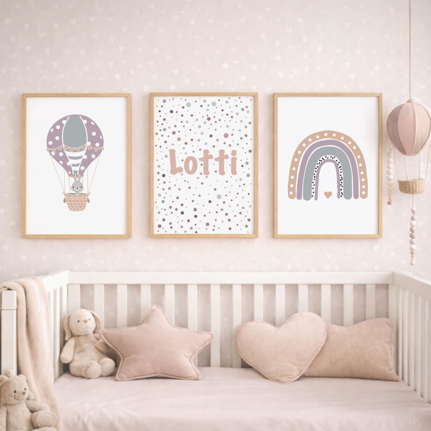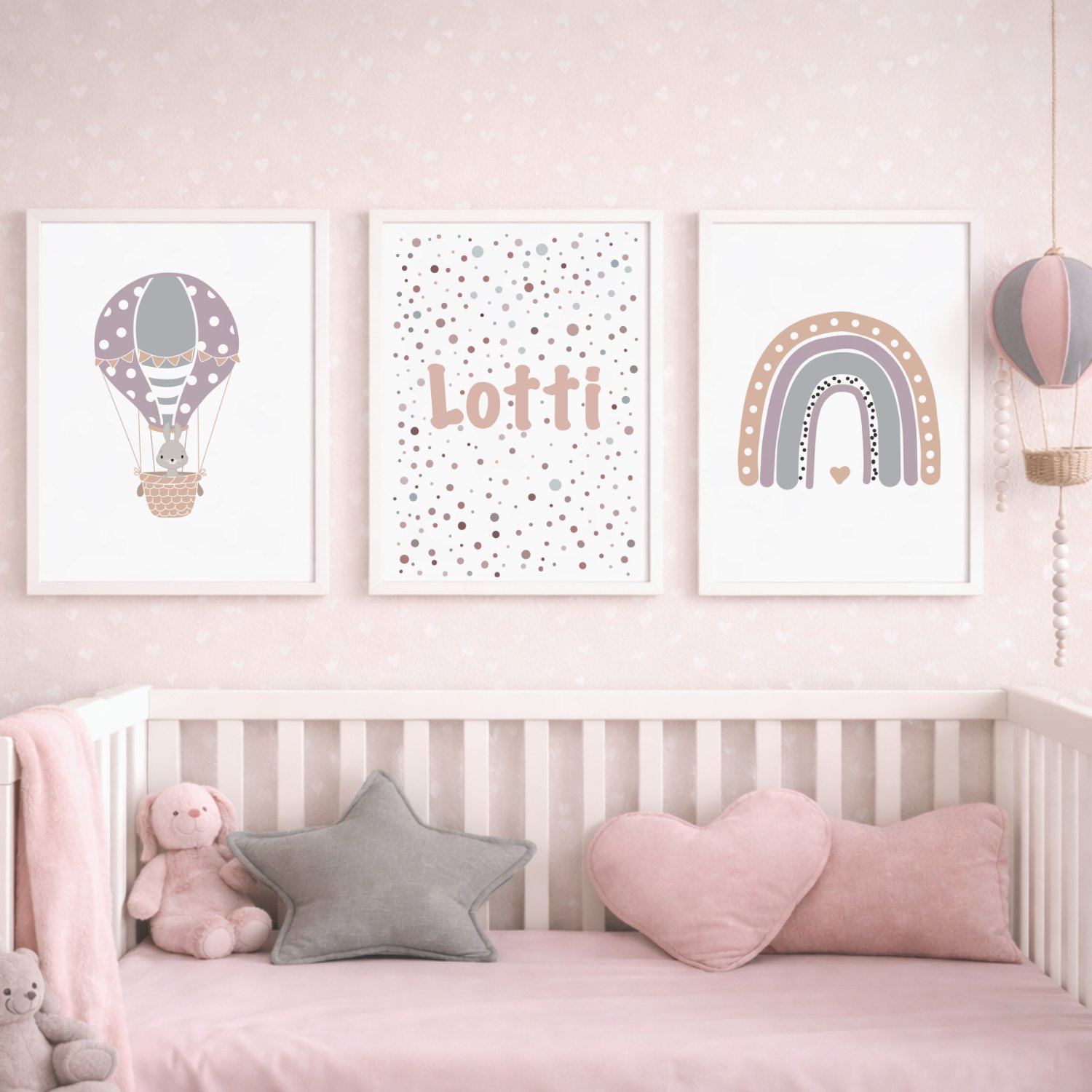 Egyedi, személyre szabható képösszeállítás, mely három képből áll. Az első képen egy lenyűgöző hőlégballon, a második képen a gyermek neve szerepel, míg a harmadik képen egy szivárvány látható. Tökéletes ajándék, amelyet a vásárló személyre szabhat, hiszen megadhatja a gyermek nevét, hogy még különlegesebbé tegye a műalkotást.