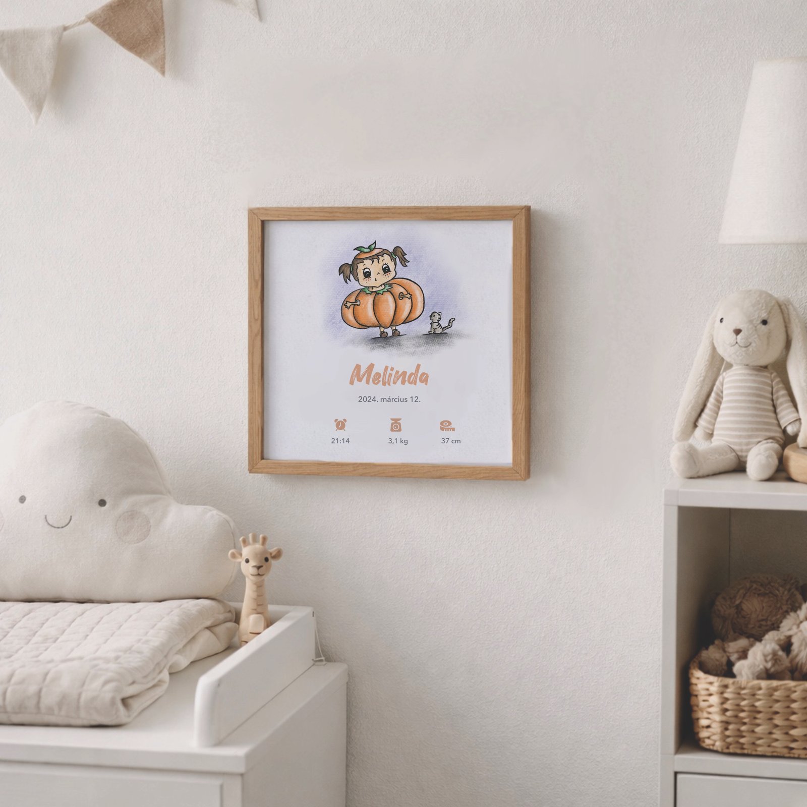 Ez a kedves sütőtök jelmezes lányt és cicát ábrázoló babaposzter különleges dekoráció a gyerekszobába. A vásárló megadhatja a baba nevét, születési adatait (dátum, súly, hossz), így igazán személyes ajándék válik belőle. Egyedi illusztráció, amely emlékként is megmarad. Nézd meg a teljes kollekciót itt: Személyre szabható babás képek.
