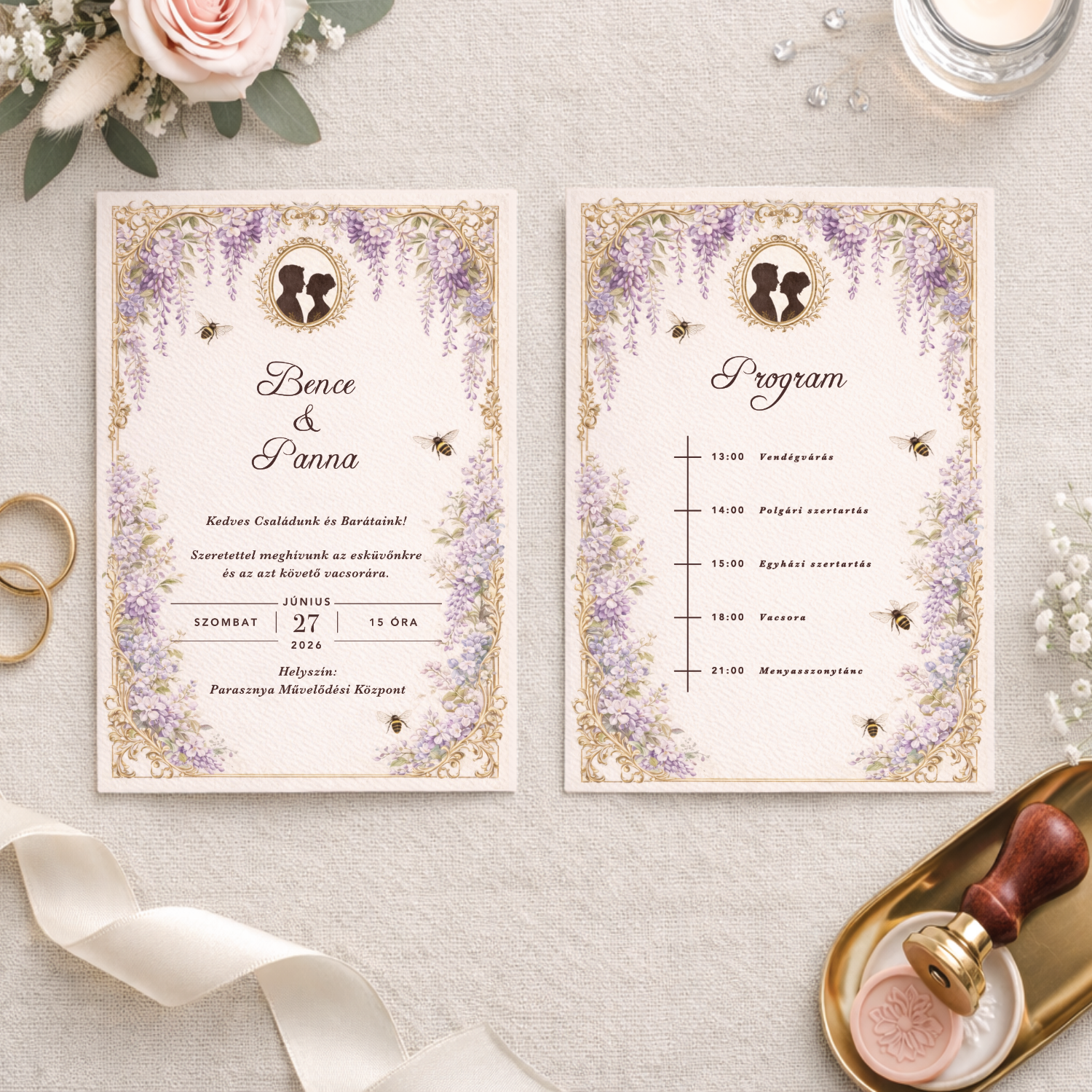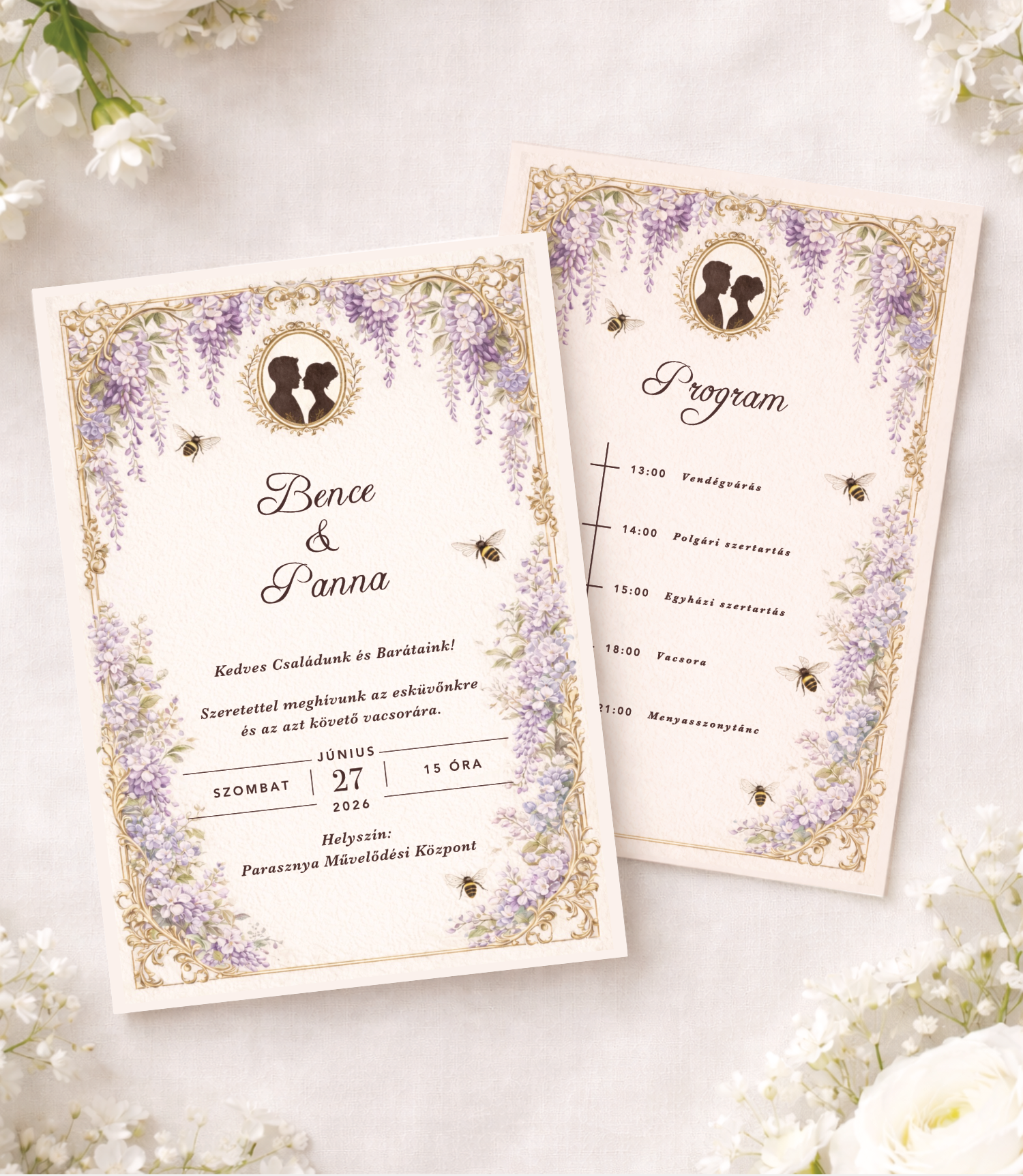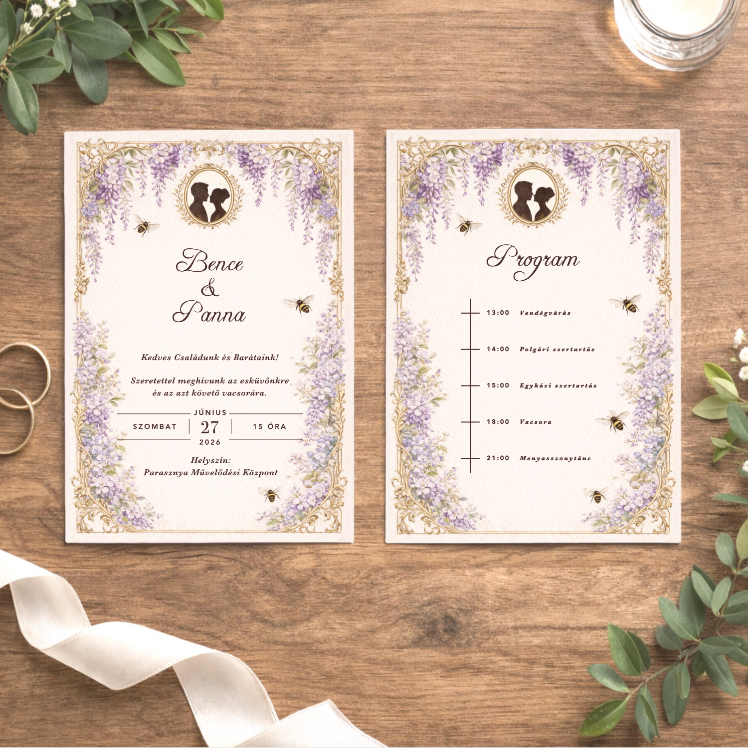 Ez az elegáns, klasszikus Regency-stílusú esküvői meghívó a 19. századi romantikus hangulatot idézi, finom díszítéssel és kifinomult tipográfiával. Tökéletes választás azoknak a pároknak, akik szeretnének elegáns, időtálló meghívót a nagy napra.