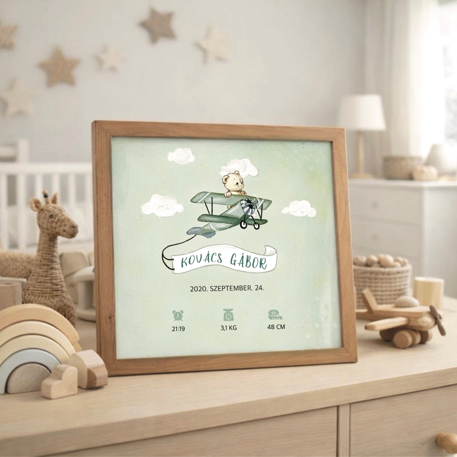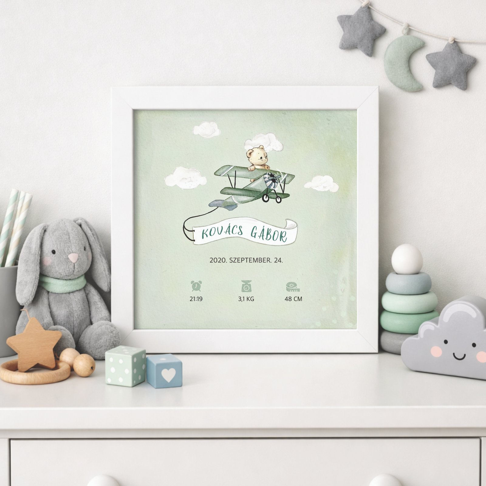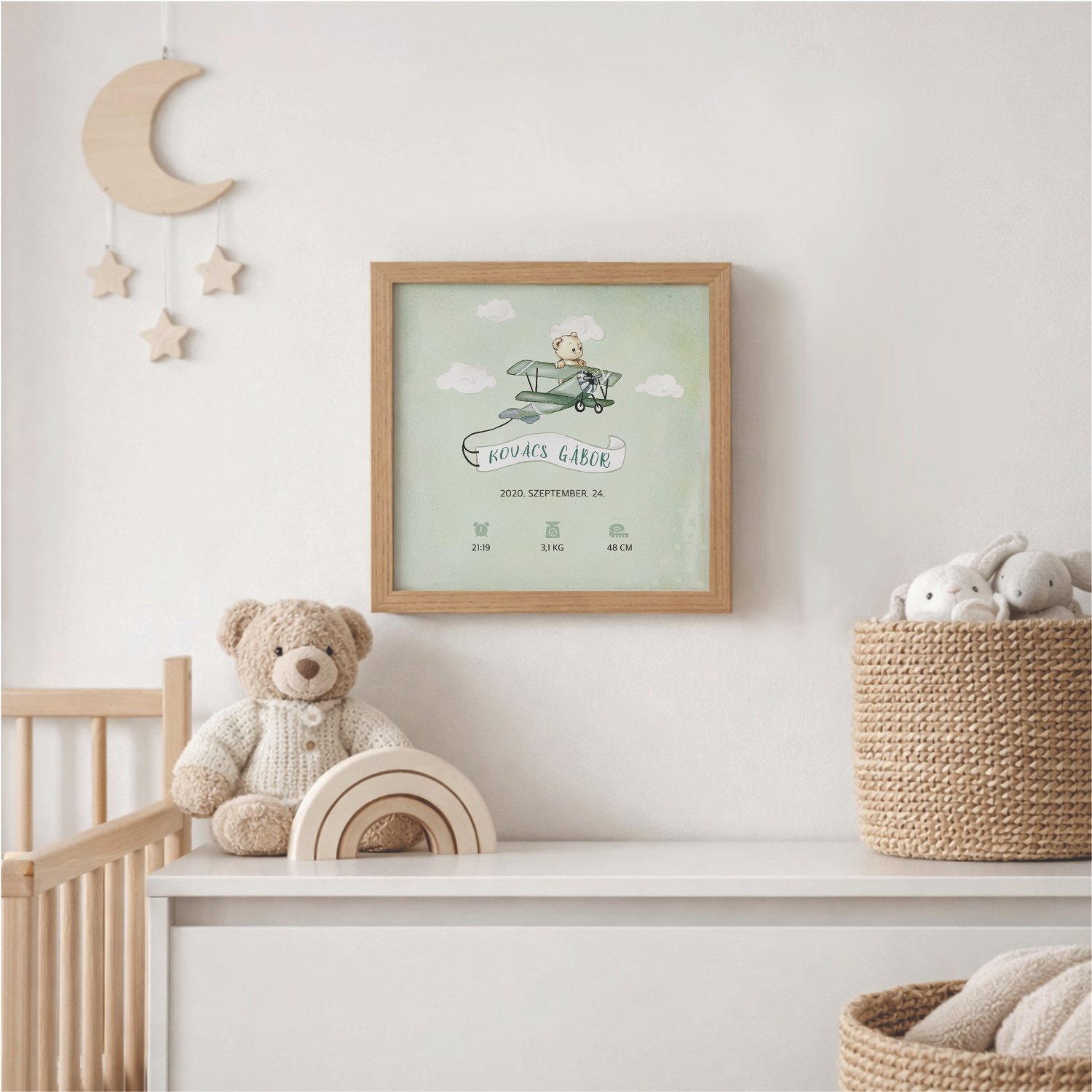 Ez az egyedi, repülő macit ábrázoló kép tökéletes ajándék minden kisgyermek számára. A vásárló személyre szabhatja a műalkotást és hozzáadhatja a gyermek nevét, születési helyét, idejét és súlyát. A kép különleges és egyedülálló módon örökíti meg a kis jövevény első fontos pillanatait. További aranyos minták: Személyre szabható babás képek