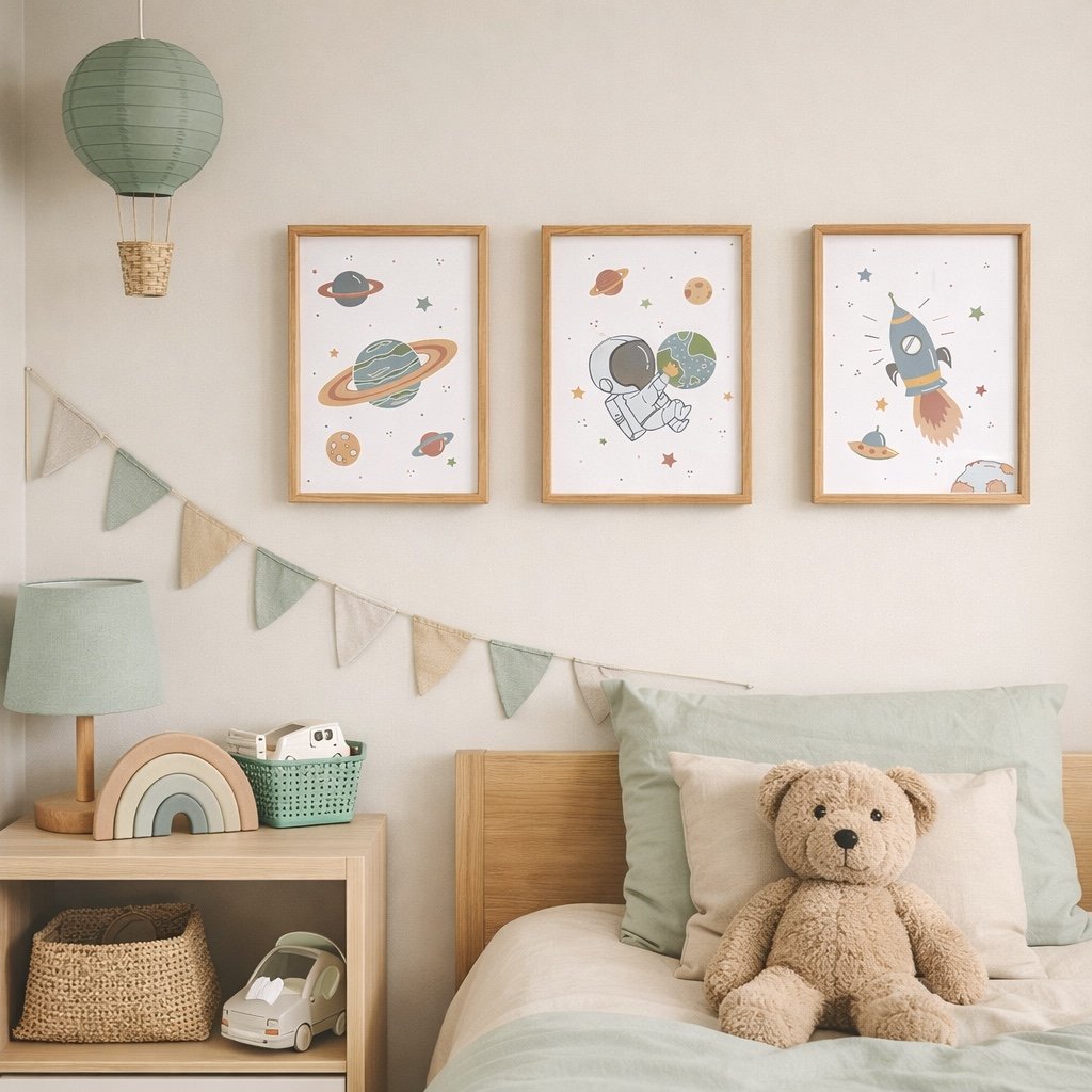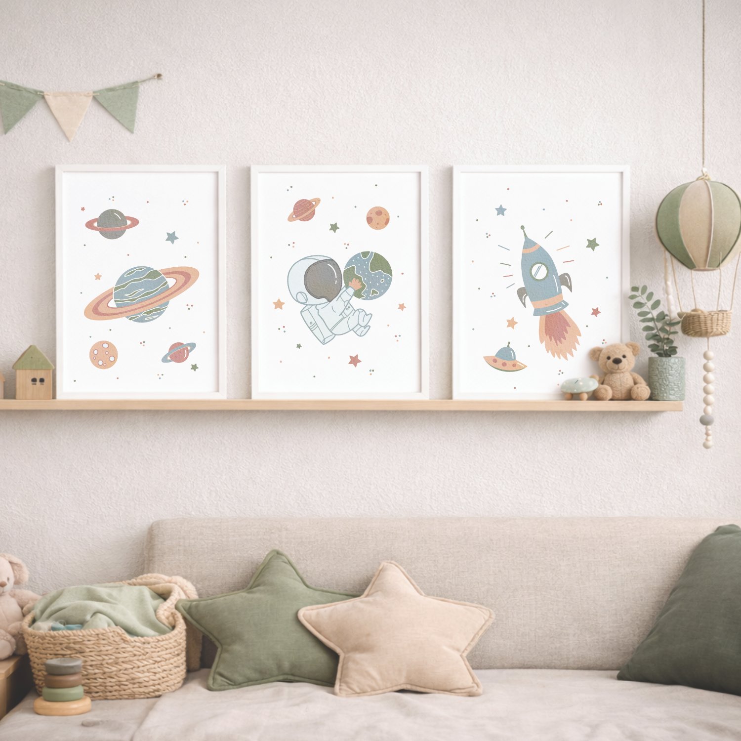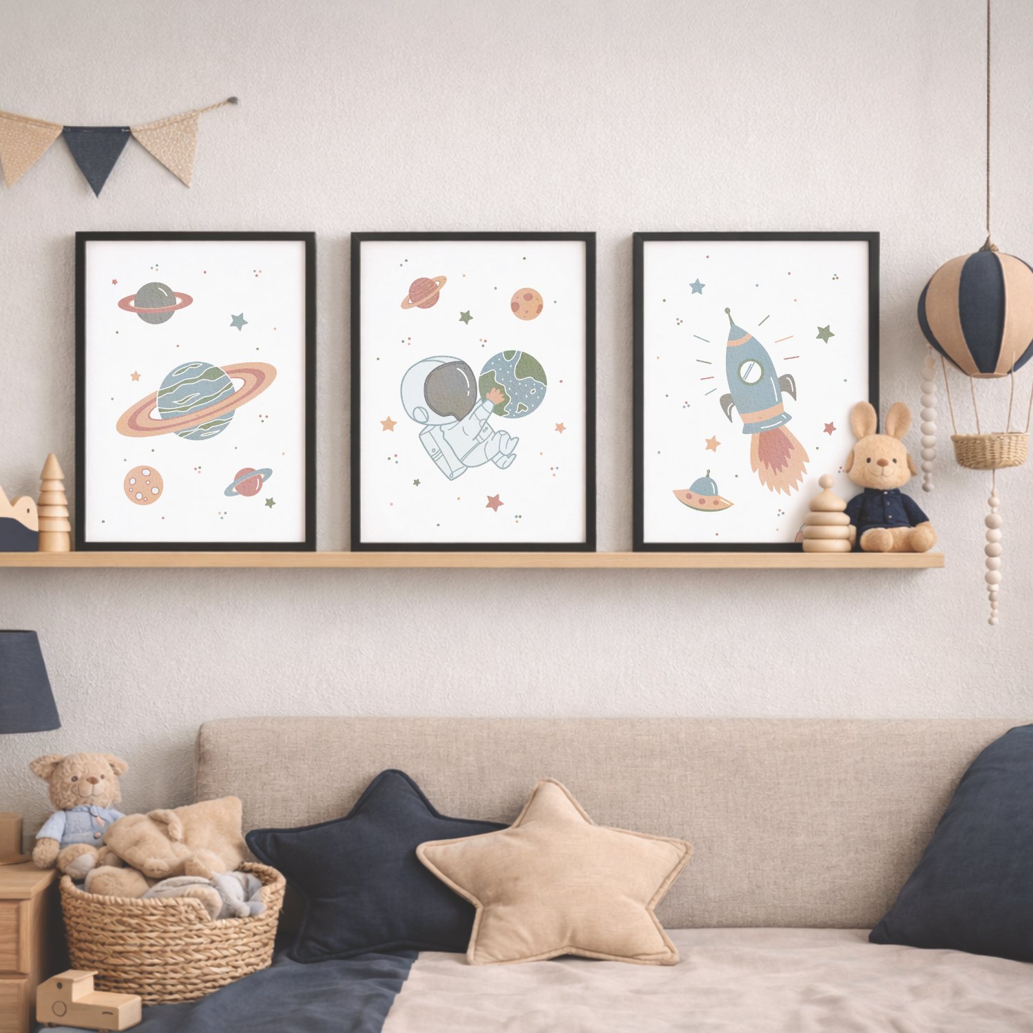 Ez a három darabos képsorozat izgalmas űr témájú dekoráció, amely tökéletes választás gyerekszobába. Az első képen egy lenyűgöző bolygó, a második képen egy bátor űrhajós, míg a harmadik képen egy futurisztikus űrhajó szerepel. Tökéletes ajándék a kis felfedezőknek, akik álmodoznak a csillagok alatt! Nézd meg a többi design képünket is.